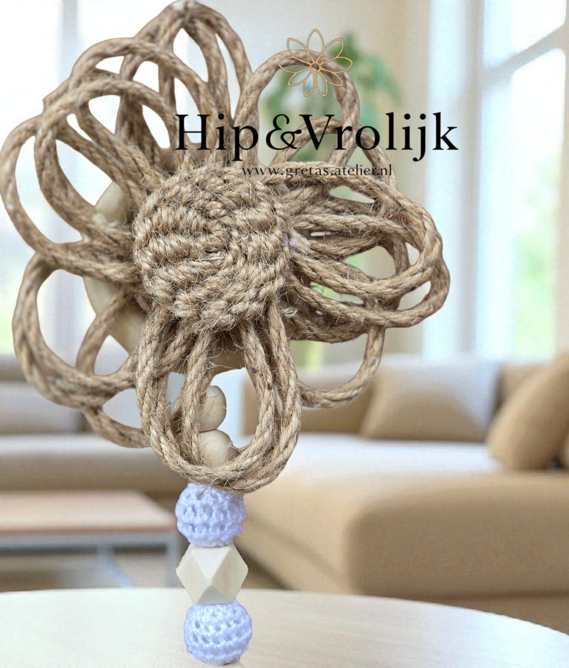 Materialen: hout, jute, touw. 1 bloem is van jute touw gemaakt en de andere bloem is van polyester vezels gemaakt