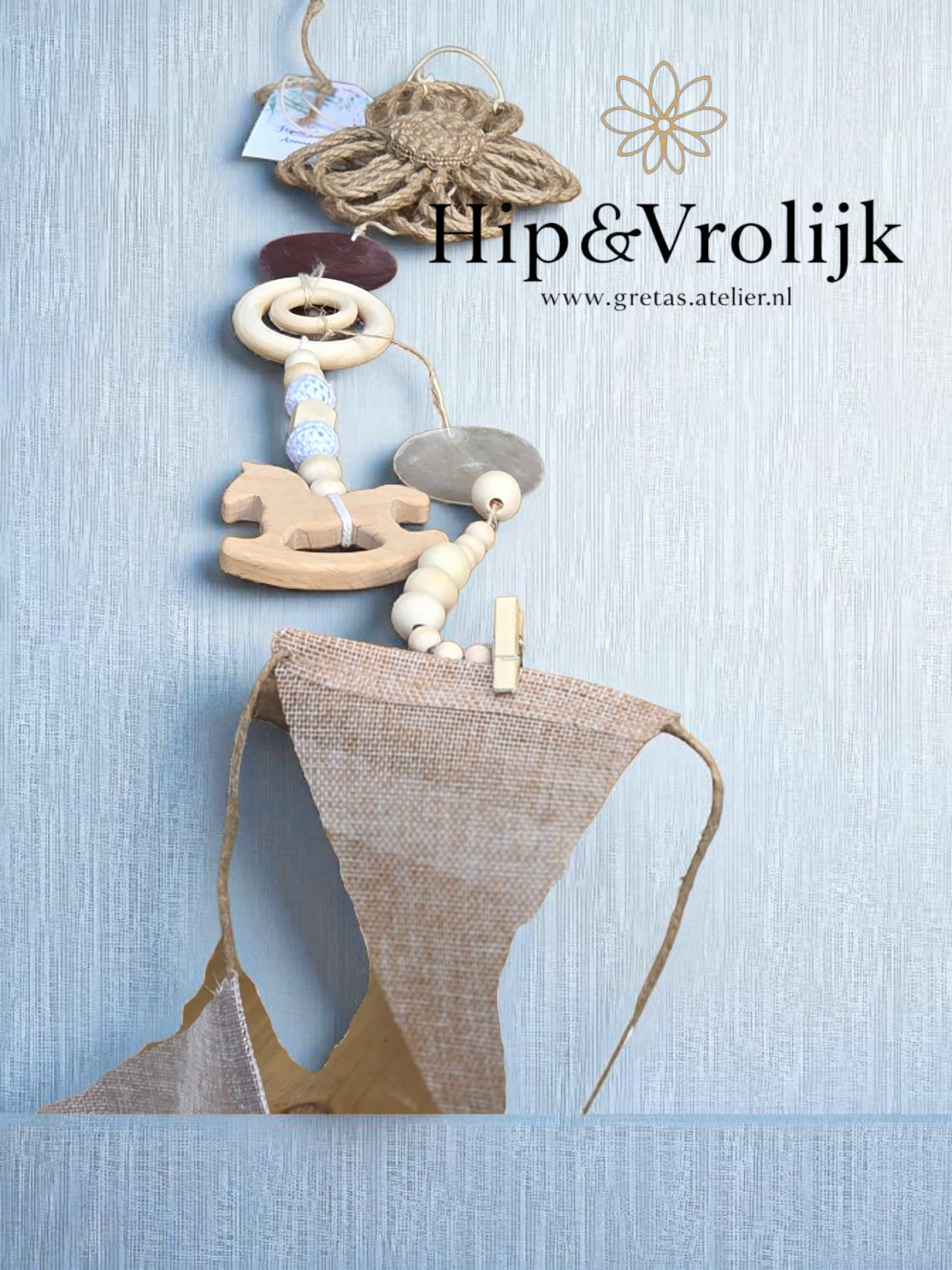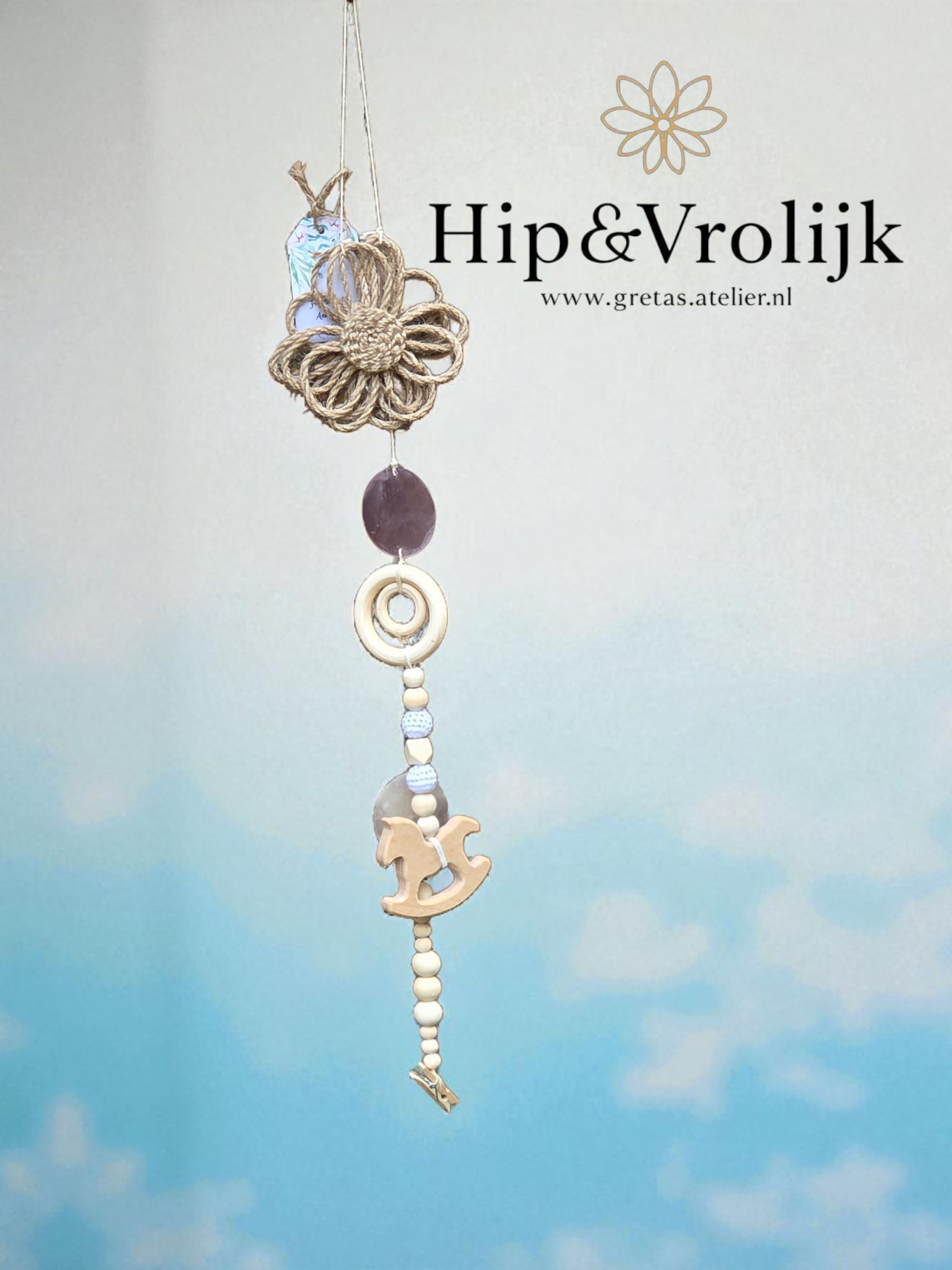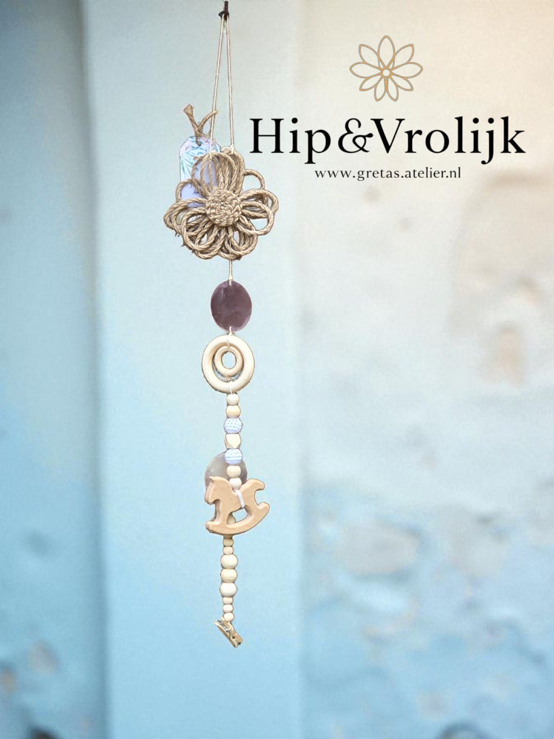 Deze unieke decoratie is met veel liefde samengesteld uit bestaande accessoires en heeft zo een tweede leven gekregen. De slinger is versierd met houten kralen en twee schitterende capiz schelpen, gecombineerd met touw van 100% katoen of stoer jute. Onderaan hangt een schattig wasknijpertje, perfect om een dierbare foto of een lief kaartje aan te bevestigen.