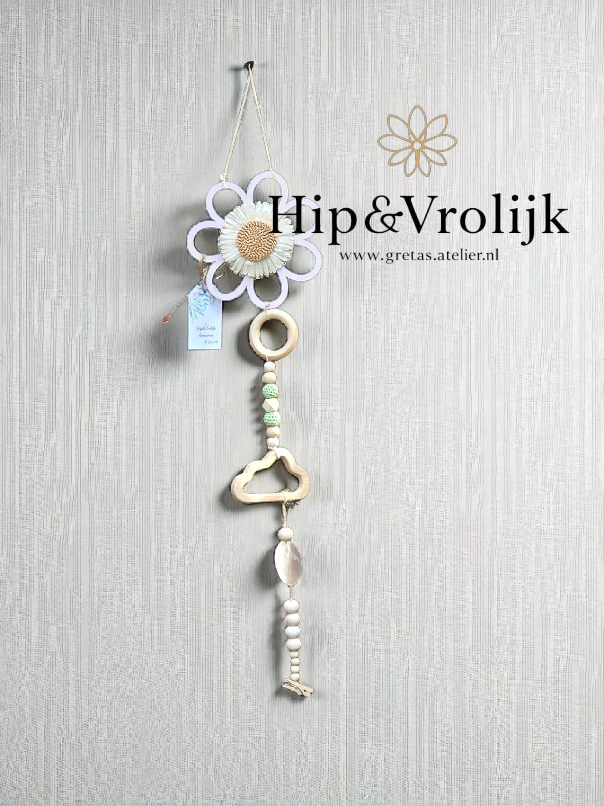 Deze unieke decoratie is met veel liefde samengesteld uit bestaande accessoires en heeft zo een tweede leven gekregen. De slinger is versierd met houten kralen en een schitterende capiz schelp, gecombineerd met touw van 100% katoen of stoer jute. Onderaan hangt een schattig wasknijpertje, perfect om een dierbare foto of een lief kaartje aan te bevestigen.
