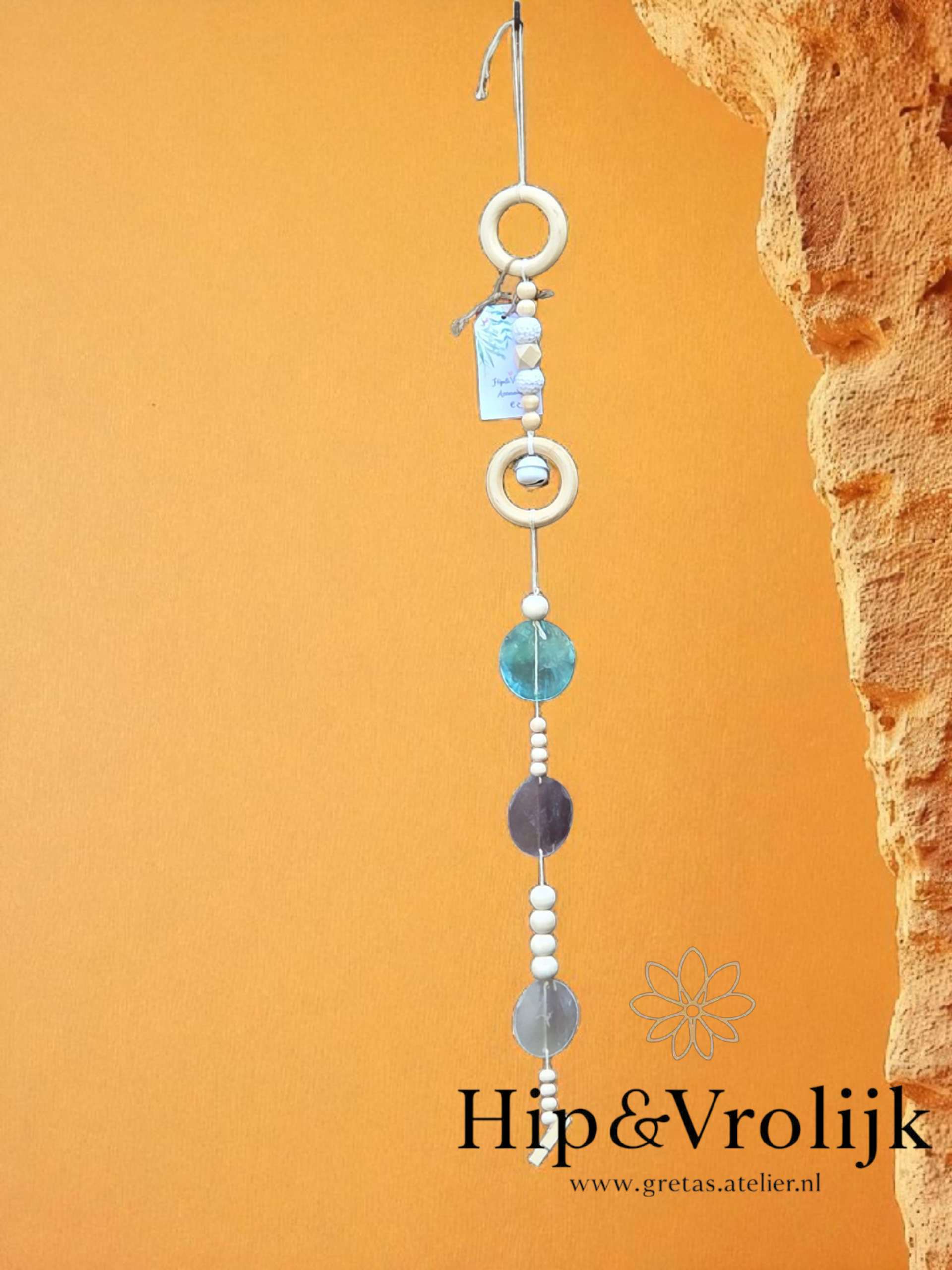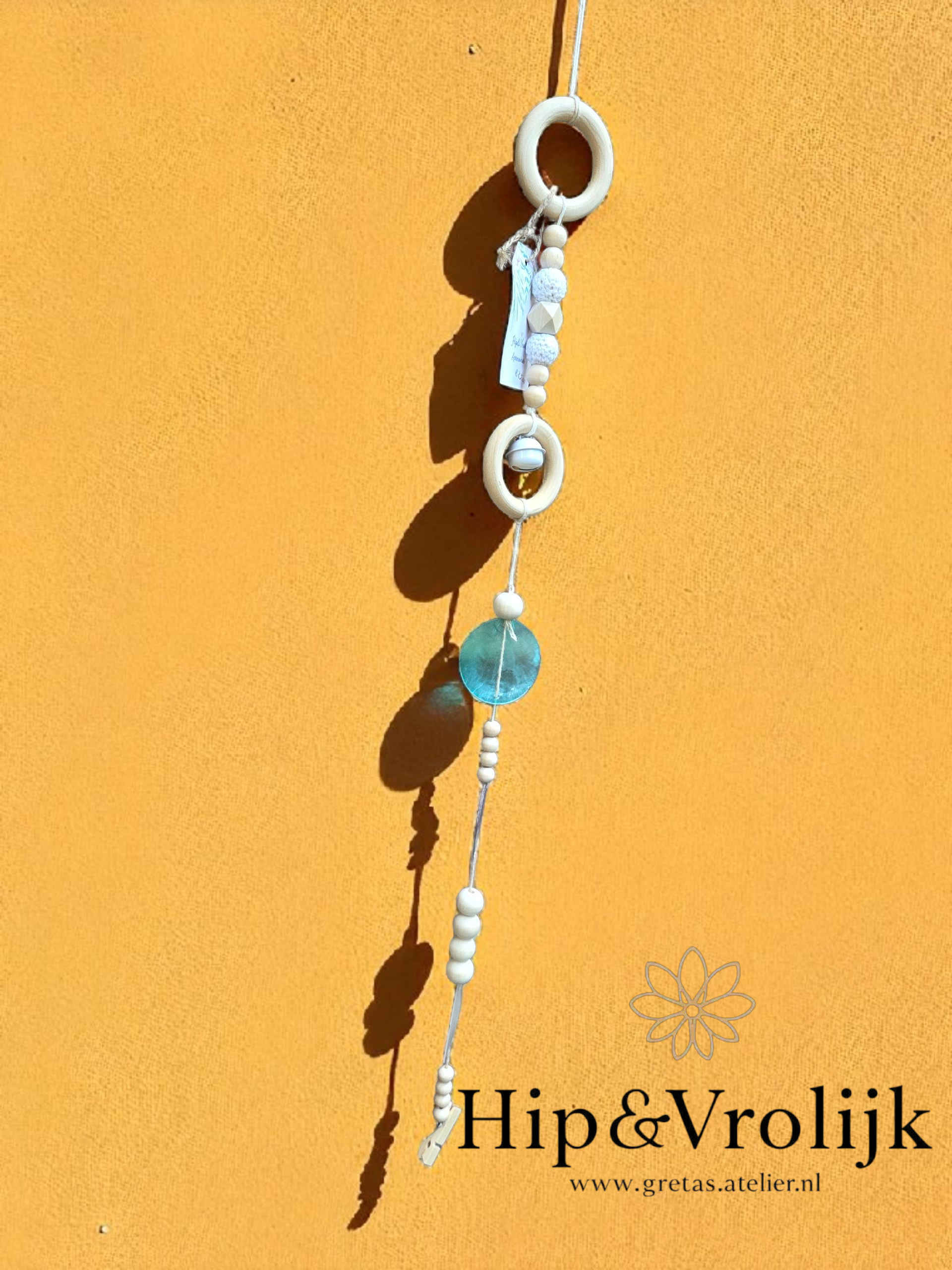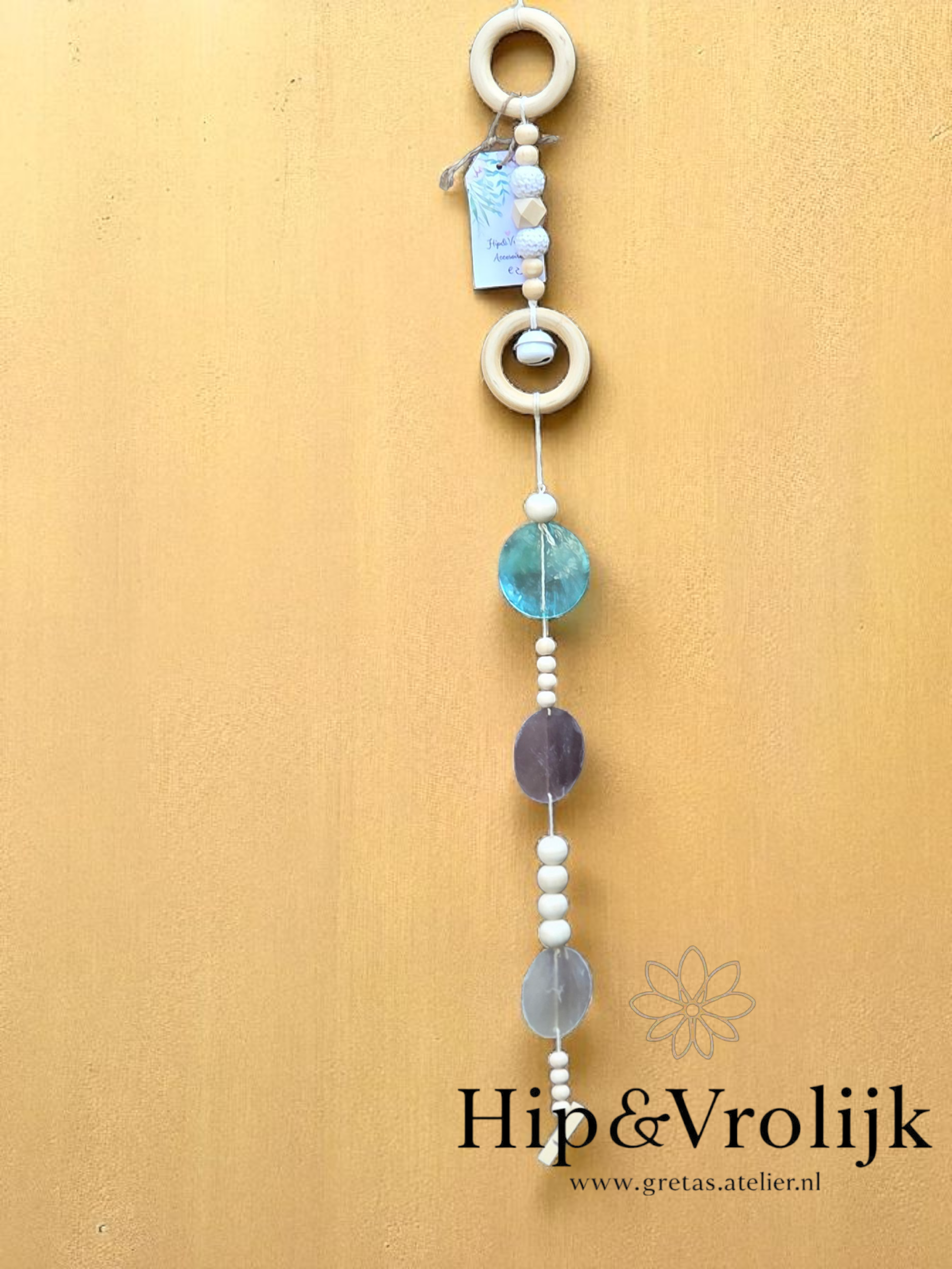 Deze unieke decoratie is met veel liefde samengesteld uit bestaande accessoires en heeft zo een tweede leven gekregen. De slinger is versierd met houten kralen en schitterende capiz schelpen, gecombineerd met touw van 100% katoen of stoer jute. Onderaan hangt een schattig wasknijpertje, perfect om een dierbare foto of een lief kaartje aan te bevestigen.